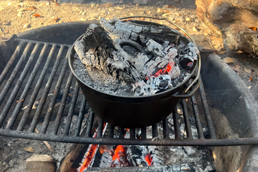 - Put dutch oven in fire and place 8 coals on the bottom and 17 coals on the top. This coal distribution achieves ~375°F in dutch oven cooking.