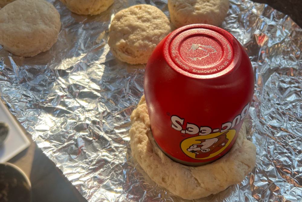 - Pat the dough flat to ¾-inch thickness on a floured surface and punch out biscuits (a drink tumbler or coffee mug is perfect for this. Bonus points if you have a Buc-ee’s wine tumbler!).