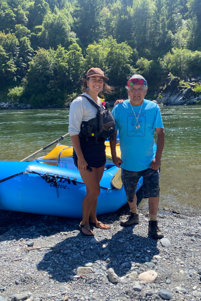 It was a community float day, with dozens of kayaks and a handful of rafts filled with parents and siblings. I was honored to row Hoopa elder Clarence down the sacred stretch of river from Aikens Creek to Weitchpec. Before putting on the water, Clarence told an infamous story about First Grandmother. He shared the significance of this old village site and the six-mile stretch of river we were to float that day. A storytelling practice to honor the knowledge held in the land and river.
