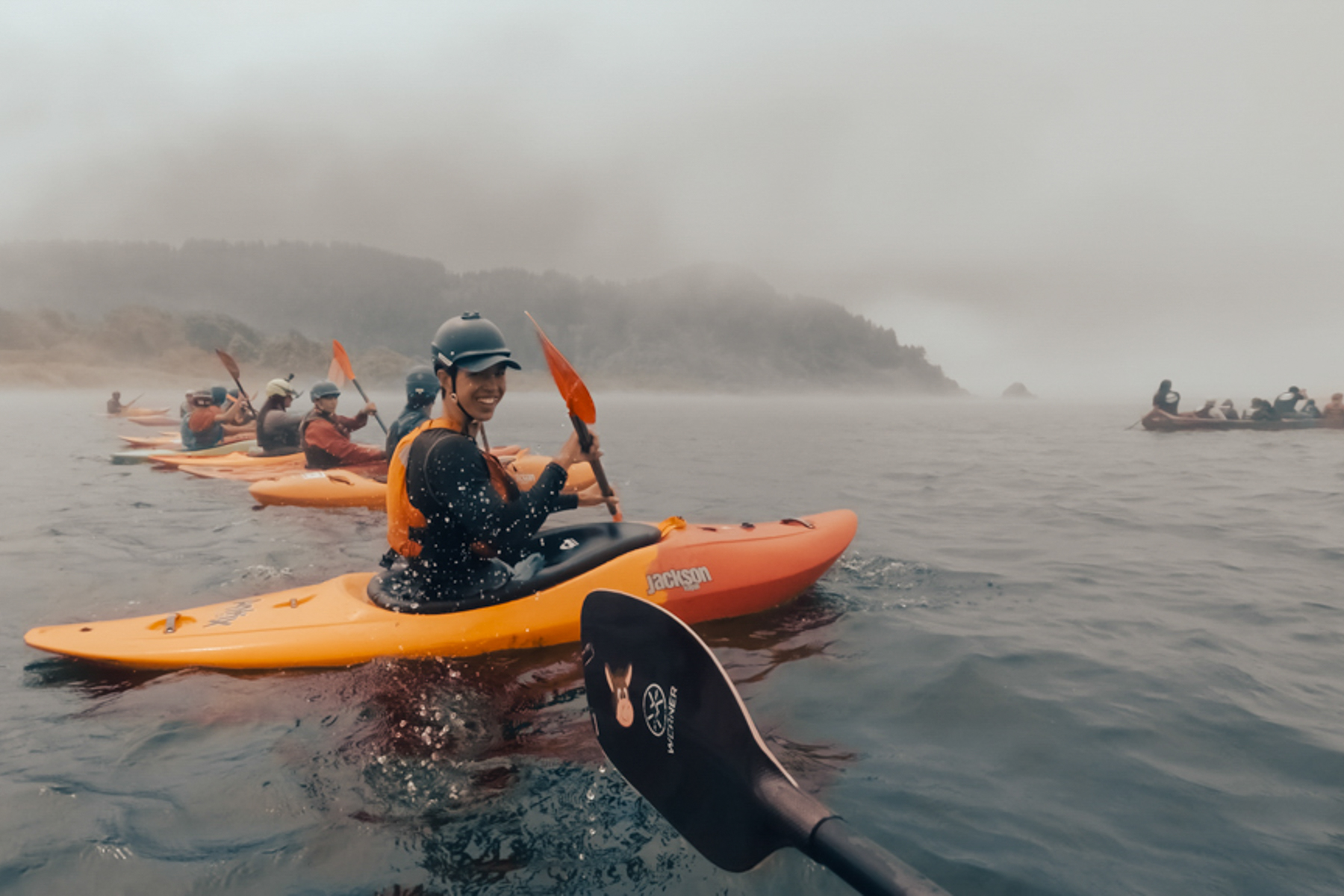 It was a scene straight from Pirates of the Caribbean, Rez edition. A rainbow of kayaks paddled through dense fog as a fleet of rafts followed behind. In every way, mystical. In my culture (Diné-Navajo), the belief around fog and mist is that it is one of our connections from the physical world to the spirit world. The local Yurok woman, Brooke, on my boat that morning, seemed to be reading my mind as I pulled deeper into the clouds, saying her culture had a special belief about the spirit of the mist, too. With this, we realized in unison that all our ancestors were with us that morning, wrapping us in their presence.