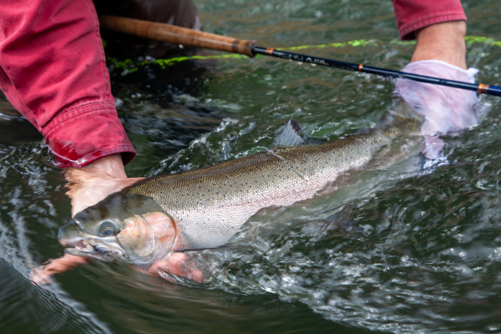 Before long the fish tired and returned to the base of the ledge, where Ken worked it smoothly to surface. I put on my tailing glove. Ken lifted just the head of the fish out of the water and swung it toward me. And as it passed by I shot out my hand and had it by the tail, a consummate closure. I cradled it just beneath the river’s surface while it breathed, gills rhythmically opening and closing. It was mint bright, pug nosed, about eight pounds, an absolute poster fish for the Deschutes. We heard a hoot and glanced up to see the boys up on the grade looking our way, smiling, laughing, fists in air!