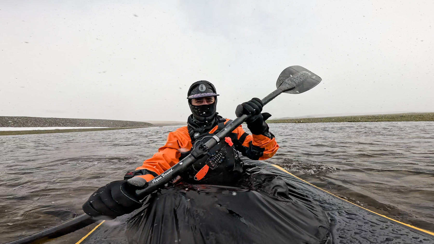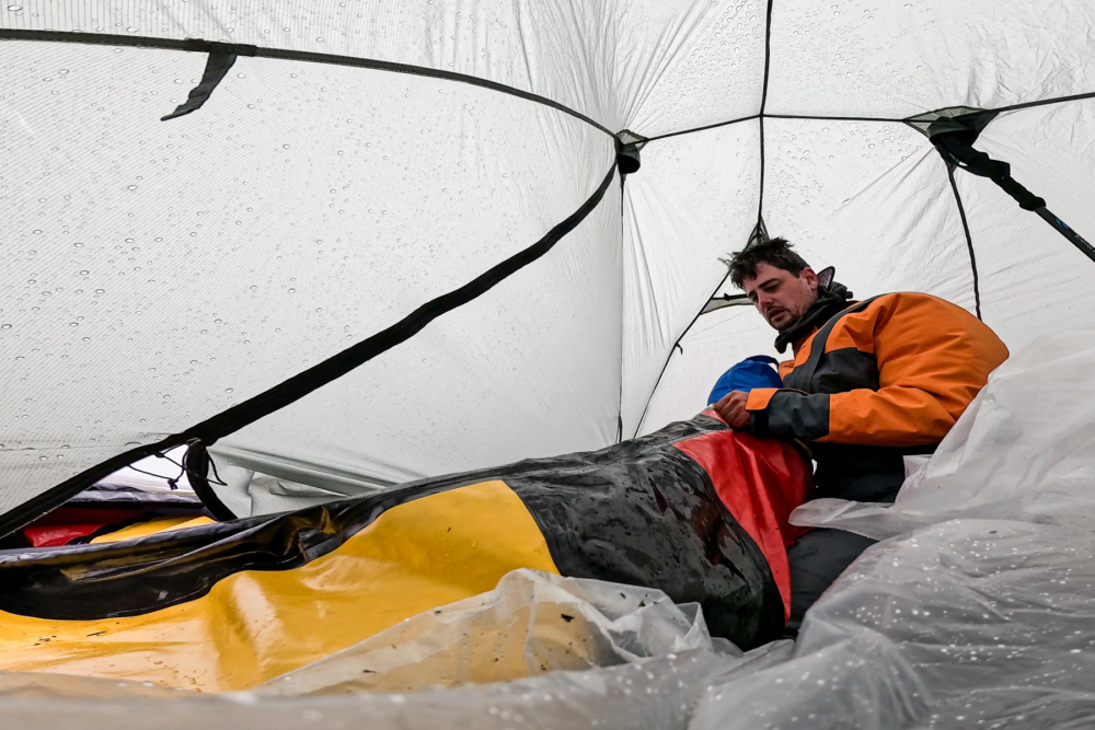Starting day seven, we remain tent-bound for the next 46 hours as winds we estimate at 70+ km/h rock our shelters. Rain drives horizontally across the lake, and snow begins to accumulate. During the storm’s peak, I venture outside barefoot (a practice from my winter paddling back home) to gather more anchor rocks and experience the intensity of the oncoming rain, wind, and snow. The dry Arctic air makes even subzero temperatures more bearable than Ottawa’s humid cold.