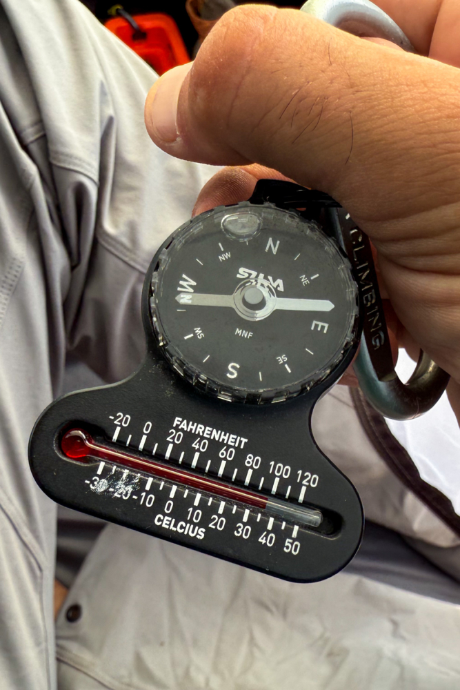 Partially frozen and finally ready to set up camp at Brock Lake, we discover a historical tent ring. It feels remarkable to find the ring after choosing the spot purely on sight from afar. Settling into my tent, I notice my Zoleo reads an incoming 10 cm of snow in the forecast, which is a real wake-up call for the coming days. I contact home to let them know of the weather, and an alternate pick-up plan.