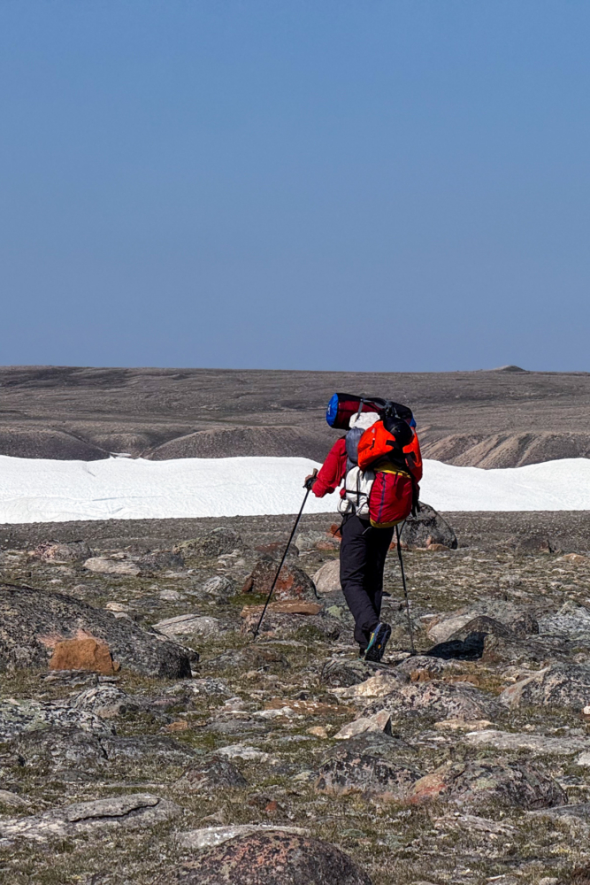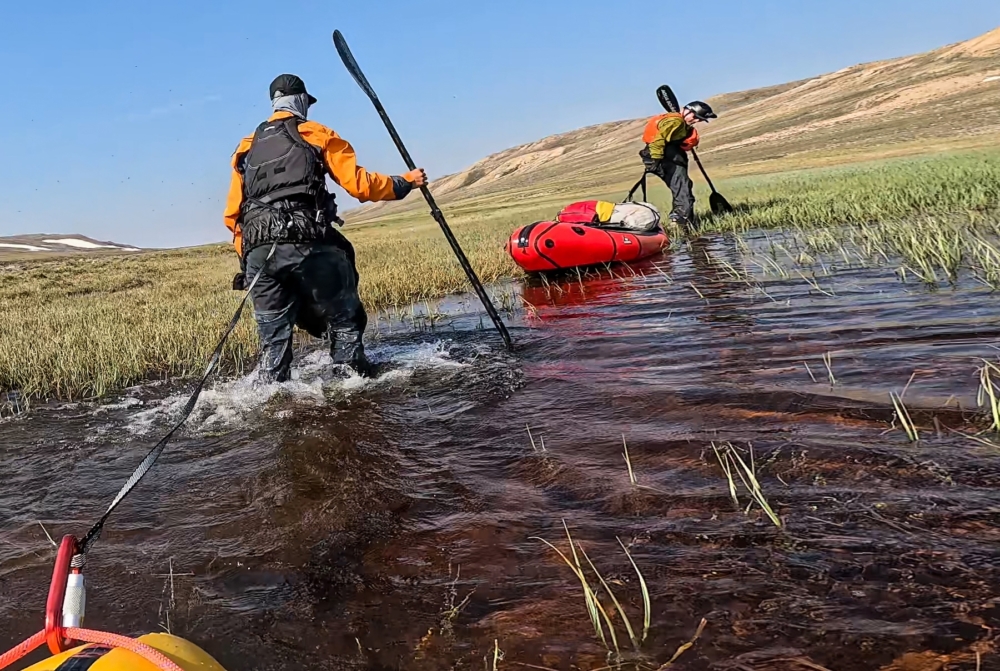 What we optimistically estimated as a three-kilometer crossing becomes a 10-kilometer slog through marshland, tussocks, and occasional waist-deep ponds. We keep the rafts inflated and pull them like sleds through water and grass, dry suits on, swarmed by bugs. The pattern becomes hypnotic: march head-down, take breaks sitting in our packrafts like sofas, hydrate, fuel up, and push again. If I avoid looking directly at where I have to walk, I tell myself, it won’t take as long to get there.