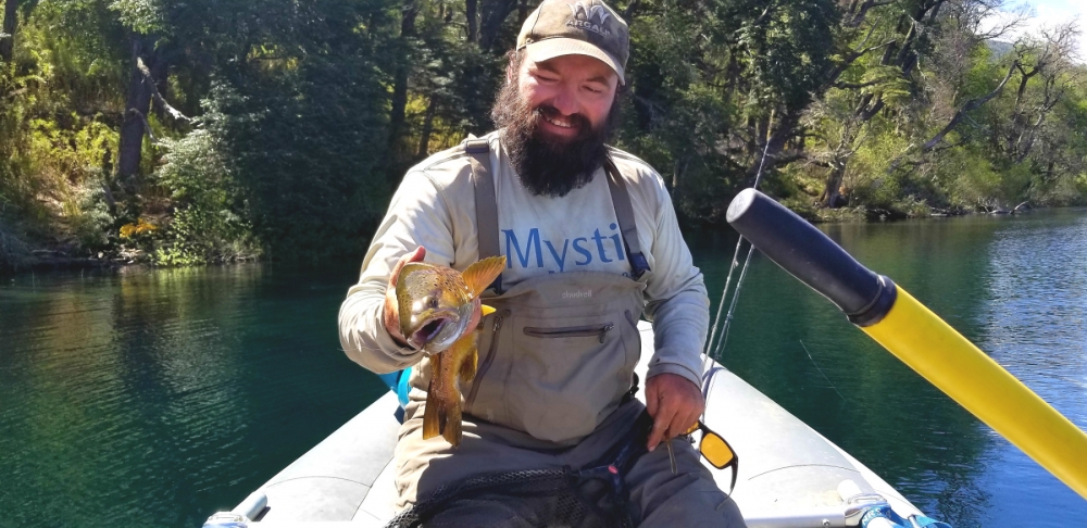 The Chimehuin, like most rivers in this region, begins at the outflow of a large lake. Lago Helquelefen sits directly beneath the stunning snow-covered Volcan Lanin, which acts as a natural filter for the river, ensuring it always runs perfectly clear. Although high, the water conditions were excellent as I assume they always are in a river that never actually experiences a state of sediment-filled runoff. We launched in one of Ron’s drift boats from his other business entity, RO Drift Boats Argentina. His son Benito joined us and two guides, Diego and Facundo ran the gear boat—an Aire cataraft, smuggled down from the states a few decades prior.