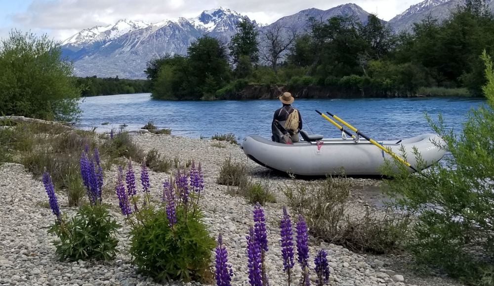 I caught fish right from the boat and when the wind started pushing, I waded flooded grass flats where trout cruised the light-colored bottom, likely looking for pancora crabs. The action was non-stop for hard fighting browns and a few rainbows tipping toward the 20-inch mark. Shale dog and I slept under the stars on a night that felt like spring turning to summer, crisp and cool, surrounded by mountains releasing snow and fields covered in lupine. Willing trout filled the next morning until the pace of the river quickened, requiring full attention on the oars until the takeout just above the border station and the summer ahead in Chile.